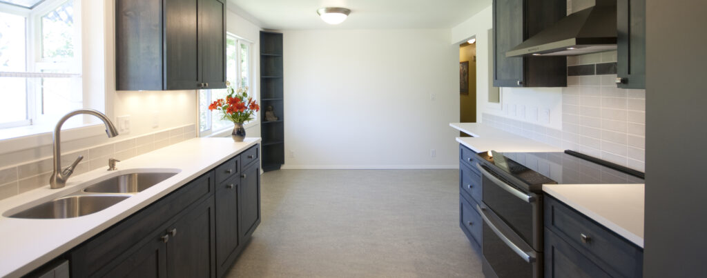 We remodeled this ranch house kitchen to maximize functionality and a feeling of spaciousness in a compact galley layout. Playful elements include a pass-through to the adjacent living room and entry, stained blue cabinets, a “floating” bar counter with hidden supports, and a display shelf that adds interest to an otherwise unused corner next to the dining table.